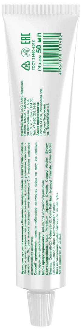 Крем для рук увлажняющий и смягчающий с глицерином и растительными экстрактами. Защищает кожу от раздражений и сухости в любое время года. Легко впитывается, не оставляет жирного блеска. Экстракт лимона насыщает кожу витамином С и оказывает защитное антимикробное действие.