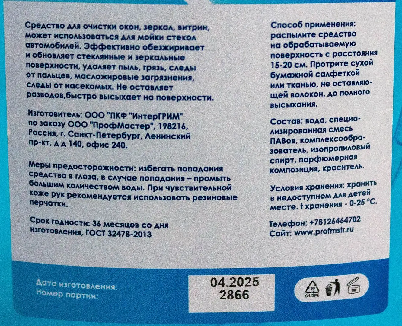 Средство для очистки окон, зеркал, витрин, может использоваться для мойки стекл автомобиля.Эффективно обезжиривает и обновляет стеклянные и зеркальные поверхности, удаляет пыль, грязь, следы от пальцев, масложировые загрязнения, следы от насекомых. Не оставляет разводов, быстро высыхает на поверхности