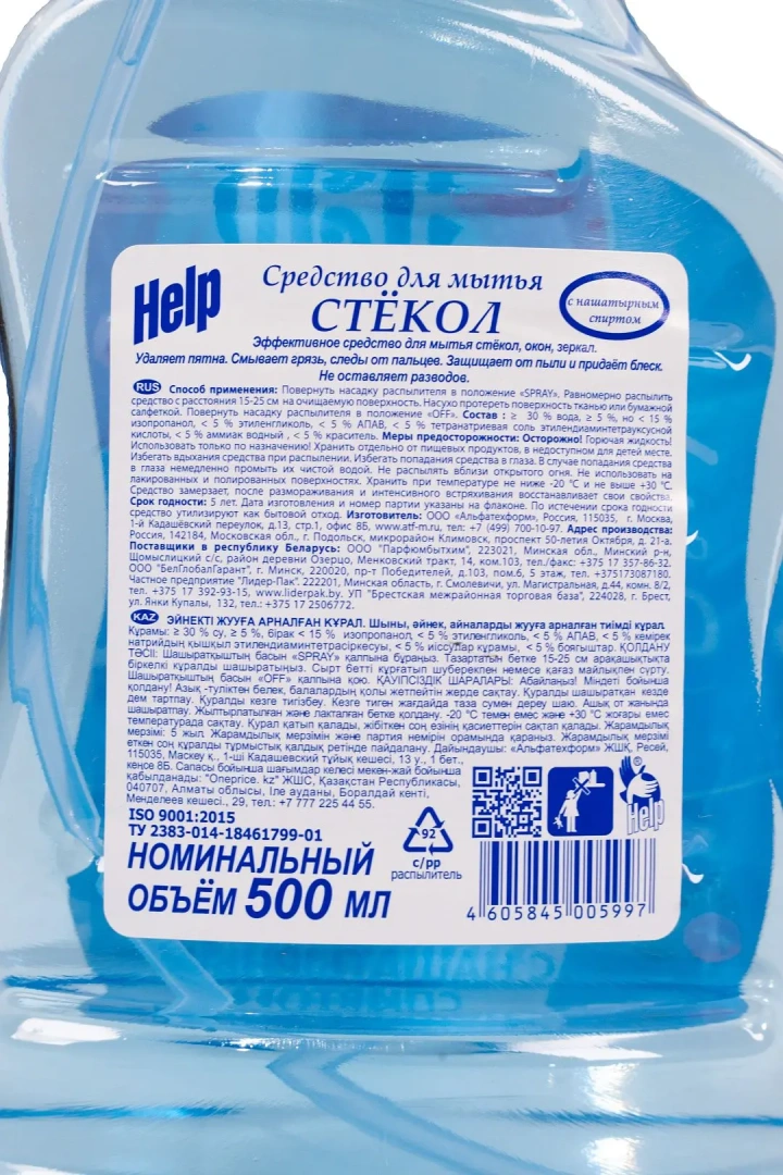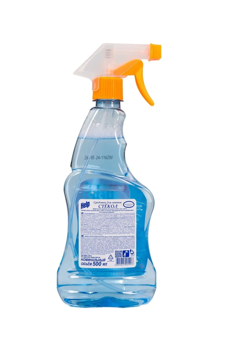 ХЭЛП 500мл для стекол (триггер) Состав отдушек "Лимон, Аромат весны, Озон, Яблоко, Апельсин": вода, нашатырный спирт, этиленгликоль, а-ПАВ, парфюм.композиция, краситель.Срок годности: 18ТУ 2383-014-18461799-01
