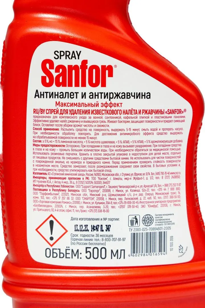 Чистящее средство: САНФОР 500мл спрей для сантехники от налета и ржавчины