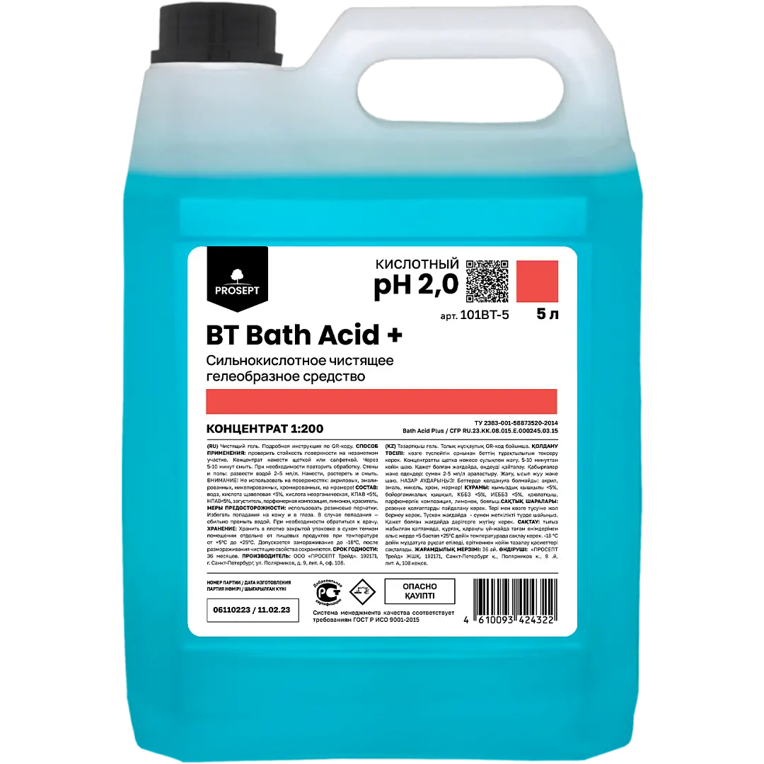 BT Bath Acid+ Сильнокислотное чистящее средство усиленного действия на основе щавелевой кислоты. Очищает сильные запущенные загрязнения - плотные слои ржавчины, известковые отложения, налеты мыльного и мочевого камня, грязе-солевые и жировые отложения. Для генеральной комплексной уборки санитарных комнат. Применяется для кислотостойких поверхностей - керамических, стеклянных, нержавеющей и хромированной стали и др. Не использовать для эмалированных поверхностей.