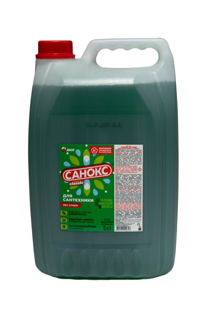 /шт.АИСТ САНОКС 5л жидкое чистящее ср-во.Предназначено для чистки раковин, унитазов, кафеля и другого сантехнического оборудования от ржавчины, известковых отложений, жировых и прочих загрязнений. Уничтожает возбудителей стафилококка и кишечных инфекций.Состав: менее 5% нПАВ, 5-15% а-ПАВ, щавелевая кислота. Дополнительно: ароматизатор, краситель.Срок годности: 18 мес.ТУ 2383-011-00335215-96.