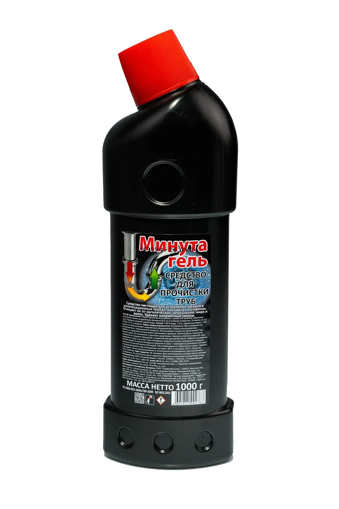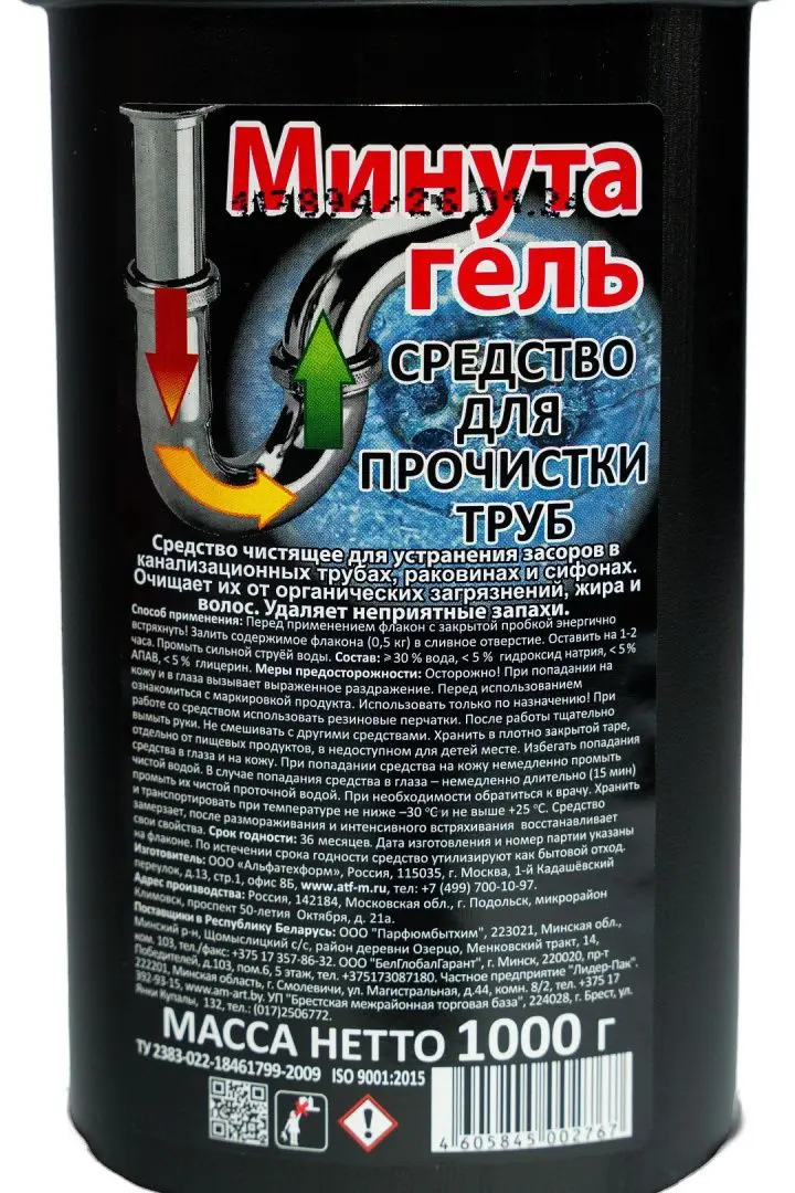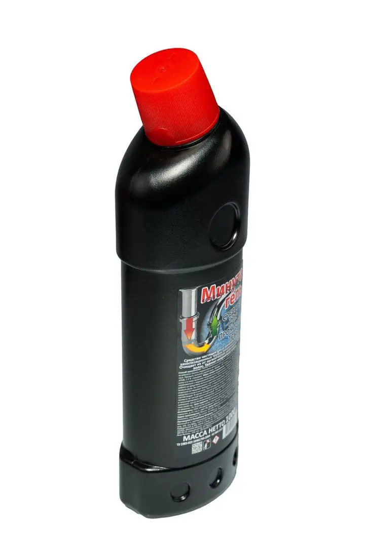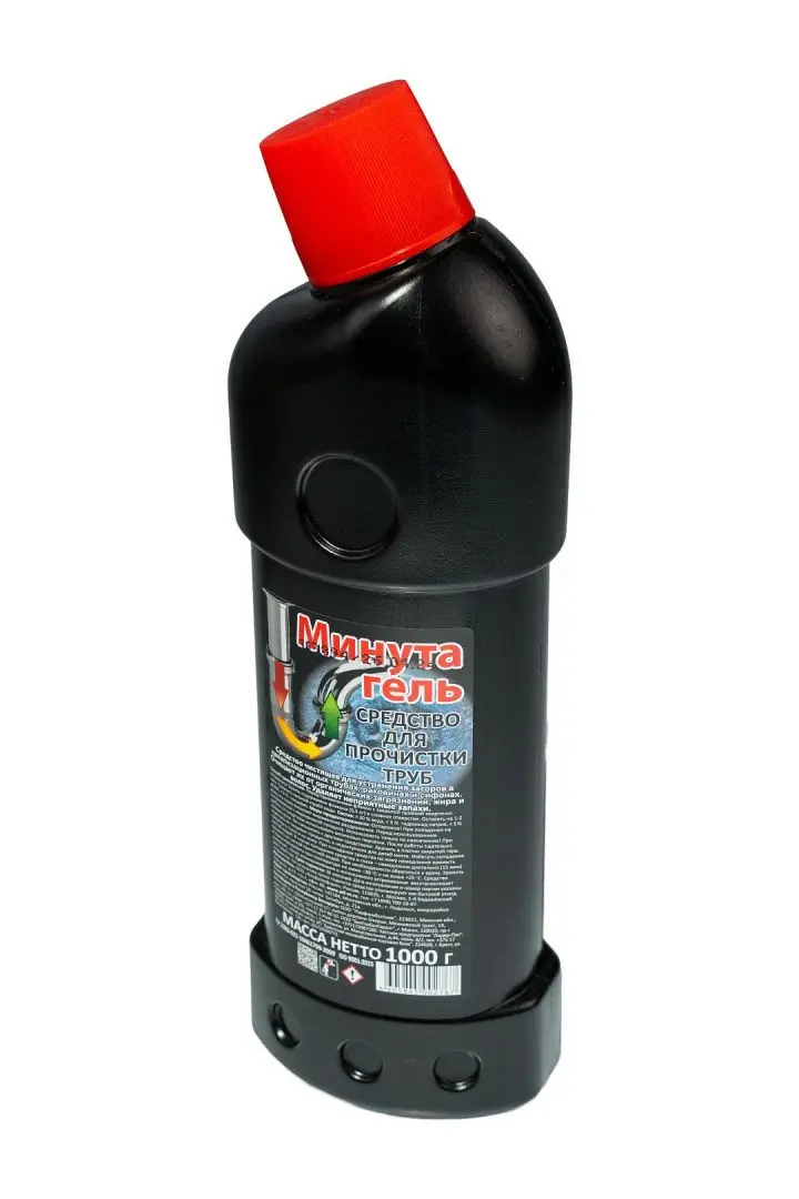 /шт.МИНУТА 1л гель для труб.Удаляет засоры и неприятный запах. Подходит для канализационных труб, раковин, сифонов.Состав: вода, гидроксид натрия, менее 5% а-ПАВ, глицерин.по ТУ.Срок годности: 24 мес.