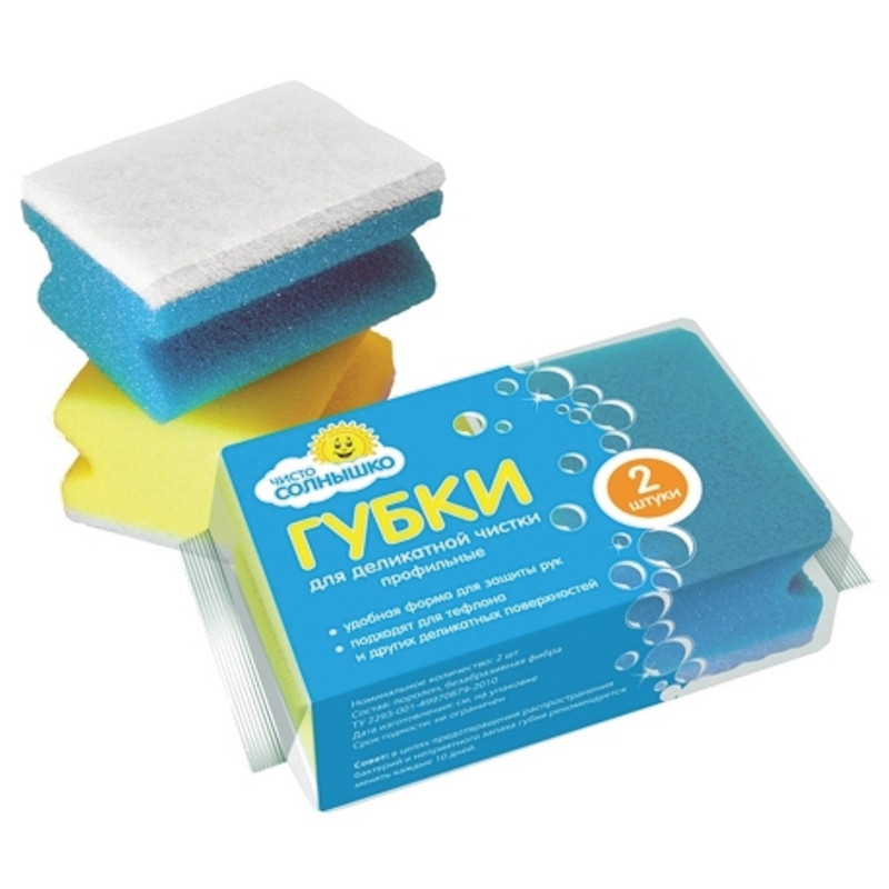 Губка для посуды Чисто Солнышко поролоновая с абразивом, профильная, пачка 2 шт.Размер: 80х63х40 мм.Цвет: в ассортименте.Абразив: белый (для деликатной чистки).В индивидуальной упаковке.