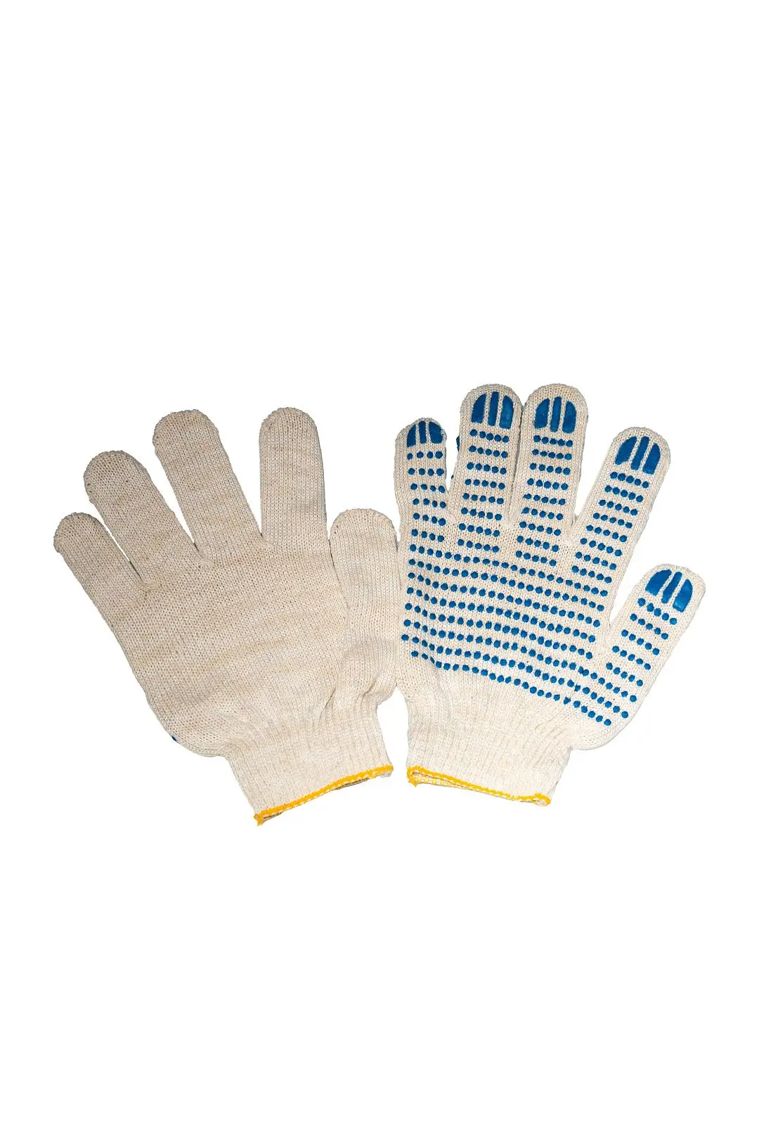 /парПерчатки х/б вязаные с ПВХ 5-ти ниточные белыеПерчатки хлопчатобумажные с ПВХ покрытием предназначены для индивидуальной защиты рук при проведении:--хозяйственных и ремонтных работ,--работ на предприятии,--в условиях производства.Предохраняют руки от повреждений, попаданий заноз, грязи от порезов, дают повышенную защиту от внешних механических воздействий. Класс вязки -10Плотность - 1325 нитейдлинна -21 смНанесение ПВХ -- точка Цвет -- Белый