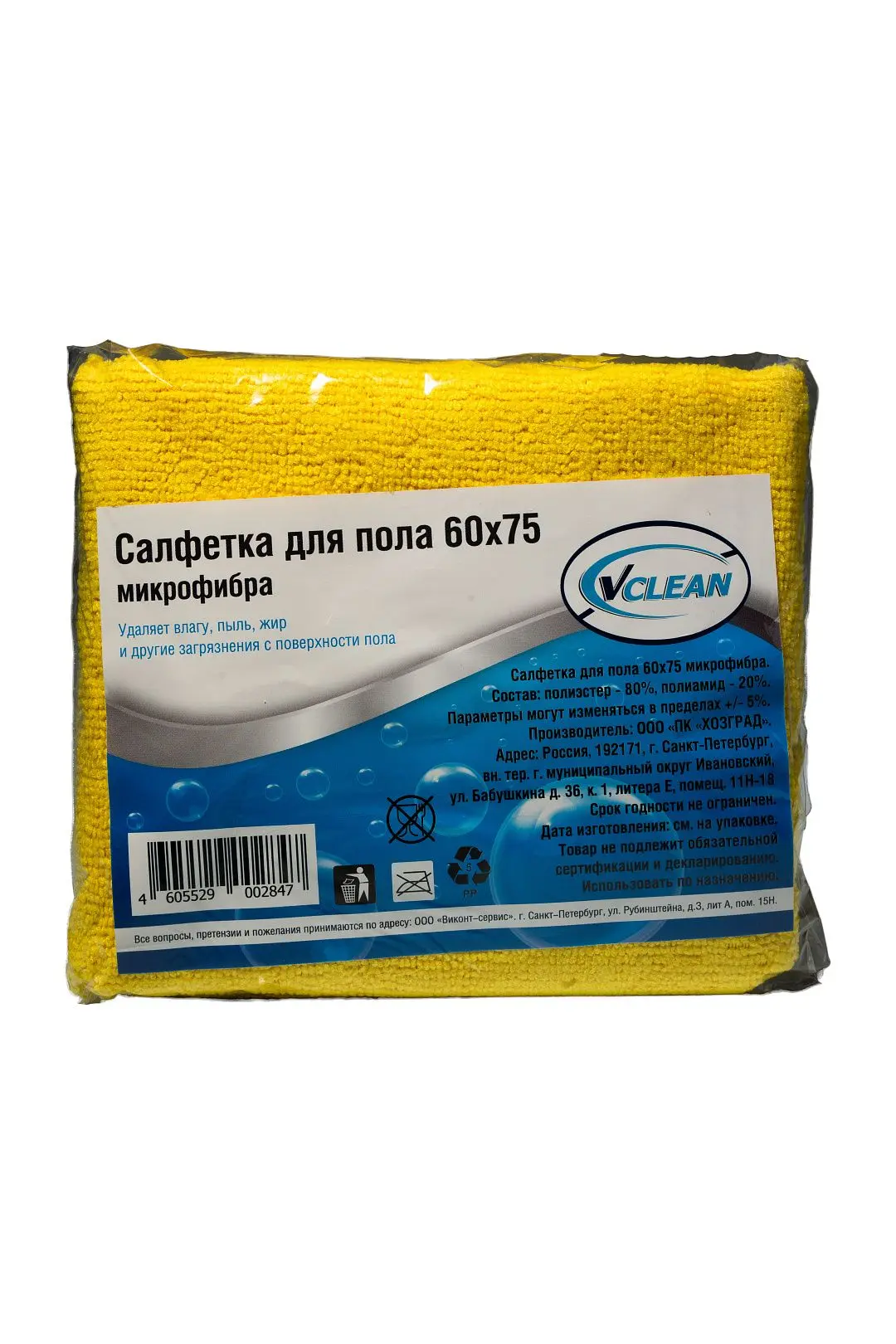 /шт.Салфетка микрофибра VCLEAN для пола.Размер: 60х75 см.Цвет: в ассортименте.Состав: 80% полиэстер, 20% полиамид.Плотность: 250 гр/м2.В индивидуальной упаковке.