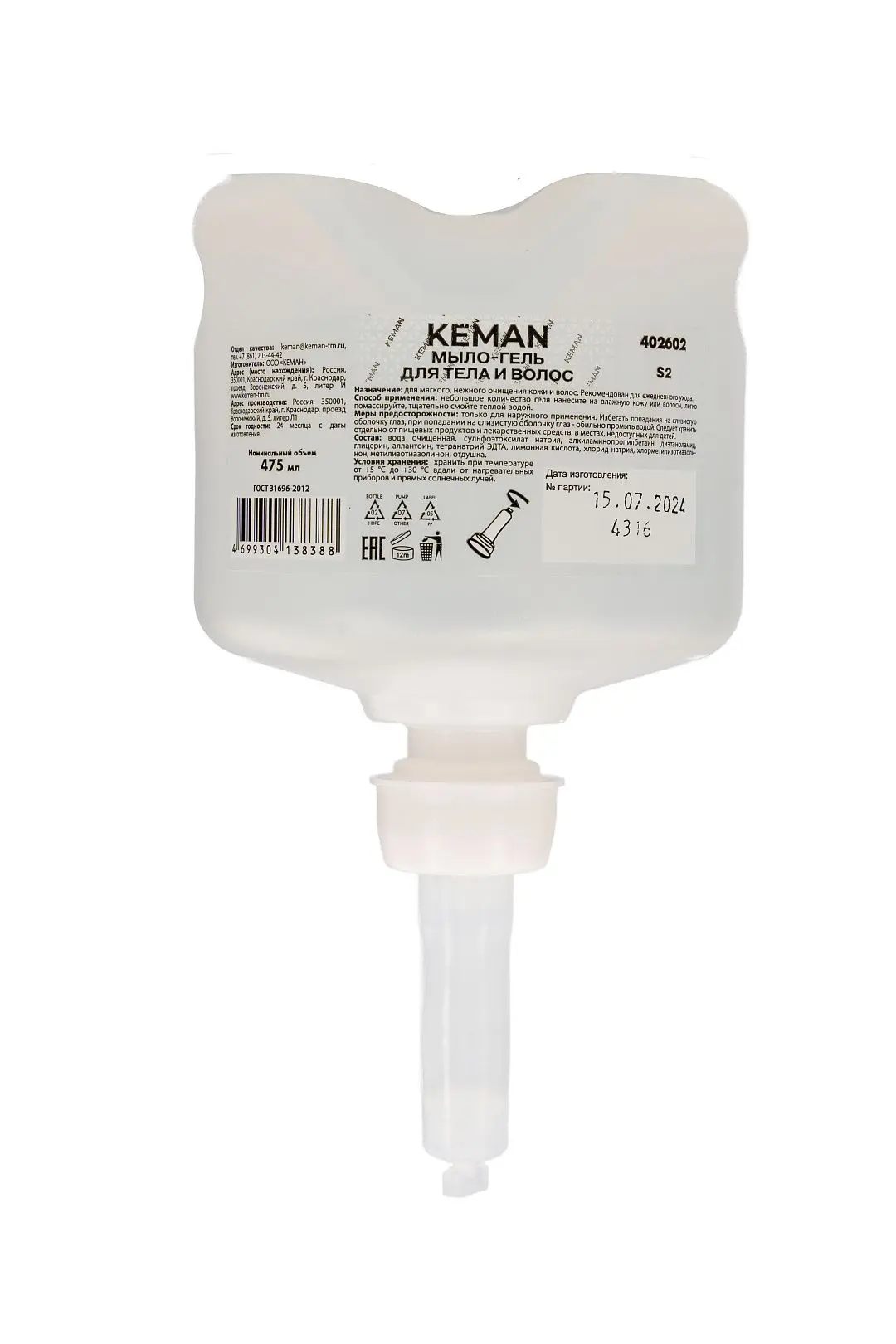 Кеман: Мыло-гель для душа 475мл для тела и волос бесцветное с отдушкой флакон S2
