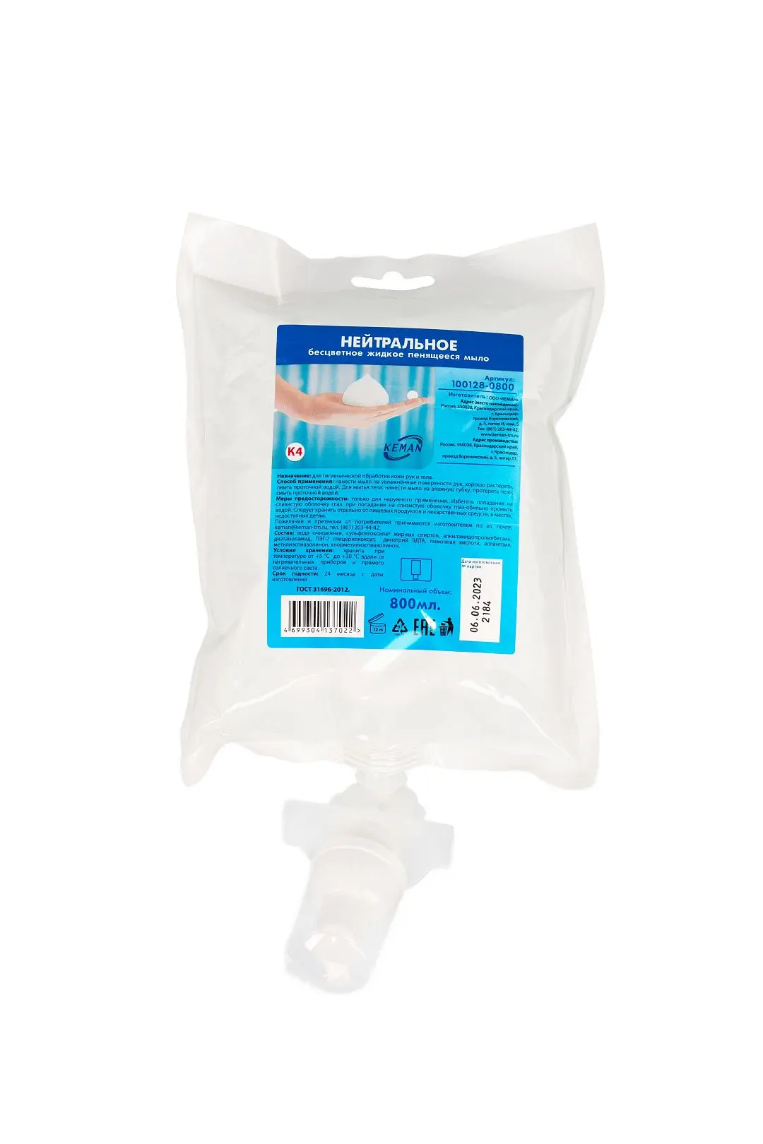 Кеман: Мыло жидкое пенящееся 800 мл нейтральное в картридже бесцветное без отдушки К4