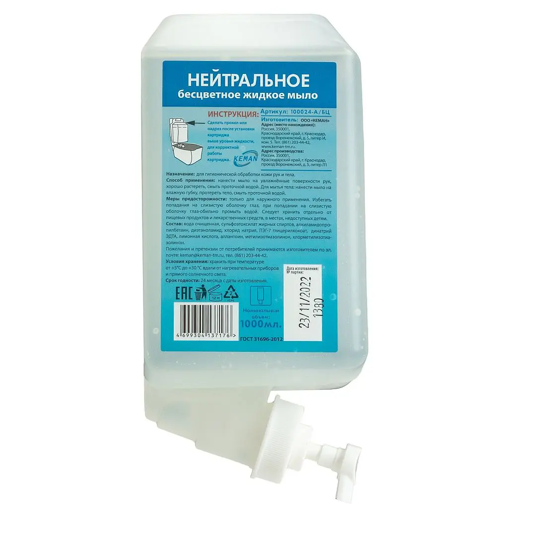 Кеман: Мыло жидкое 1000 мл нейтральное в картридже бесцветное без отдушки Aquarius А4,А5