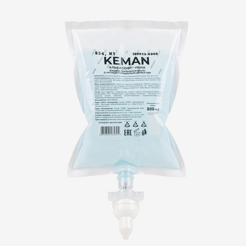 Кеман: Мыло жидкое АЛЬБАСОФТ-пена 800 мл с антибакт.эффектом в картридже бесцветное без отдушки К1,S34