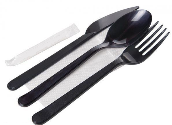 Одноразовая продукция: Набор столовых приборов 5 (вилка, столовая ложка, нож, зубочистка, салфетка) черный /пач.=300 шт.