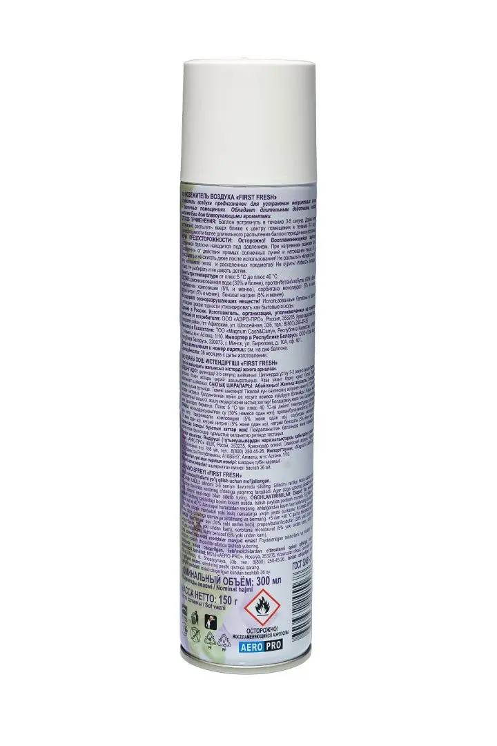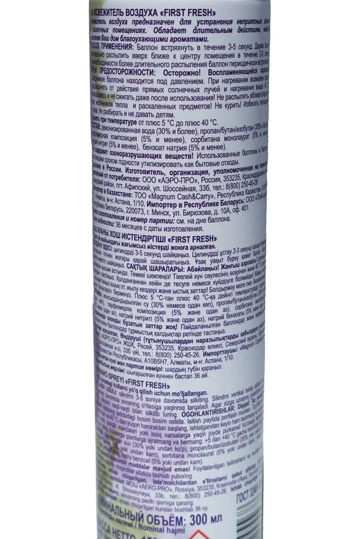 /шт.ФЕРСТ ФРЕШ 300мл Альпийская свежестьОсвежитель воздуха First Fresh «Морская свежесть» предназначен для устранения неприятных запахов в различных помещениях. Обладает длительным действием, надолго наполняя помещение неповторимым тонким ароматом. Не содержит озоноразрушающих веществ. Состав деионизованная вода (30% и более), пропан/бутан/ изобутан (30% и более), парфюмерная композиция (5% и менее), сорбитан олеат (5% и менее), натрия нитрит (5% и менее), линалоол (5% и менее)ТУ 2389-026-34995425-05СоответствуетГОСТ Р 51697-2000ГОСТ 32481-2013ГОСТ Р 51696-2000ГОСТ 32478-2013