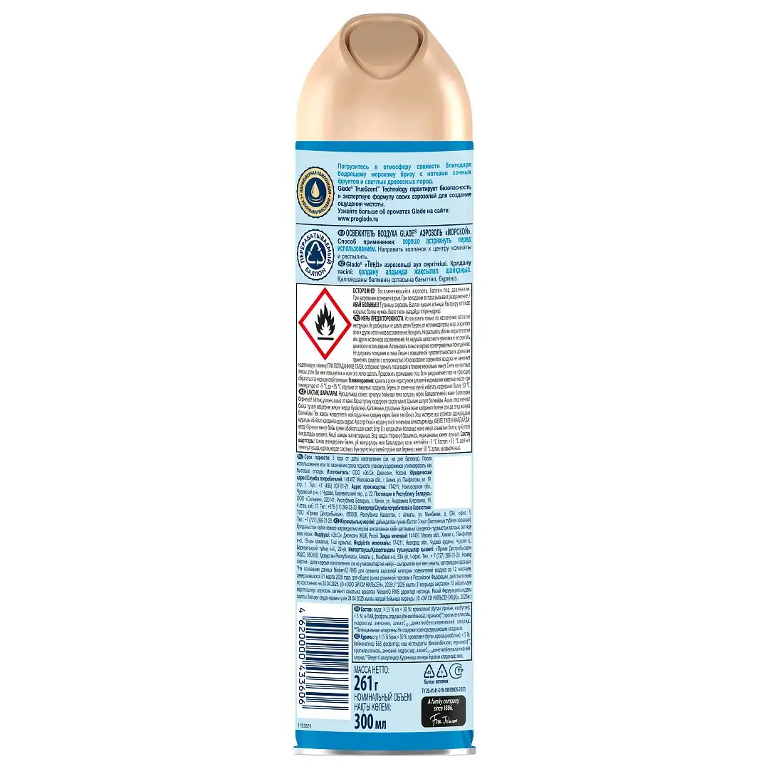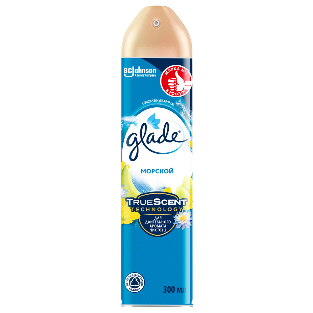 /шт.Освежитель воздуха GLADE 300мл Морской.Устраняет неприятные запахи и мгновенно освежает воздух.Распылитель по типу аэрозоль, мелкодисперсный. Срок годности: 2 года.
