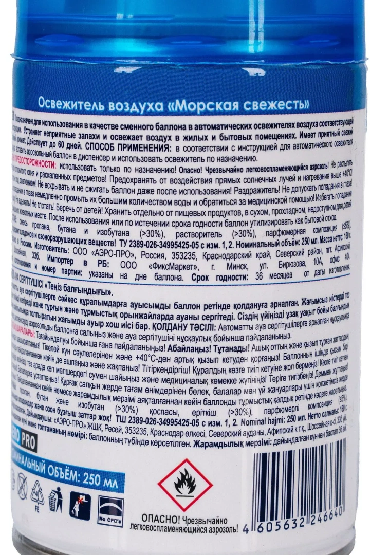 деионизованная вода (30% и более), пропан/бутан/ изобутан (30% и более), парфюмерная композиция (5% и менее), сорбитан олеат (5% и менее), натрия нитрит (5% и менее)