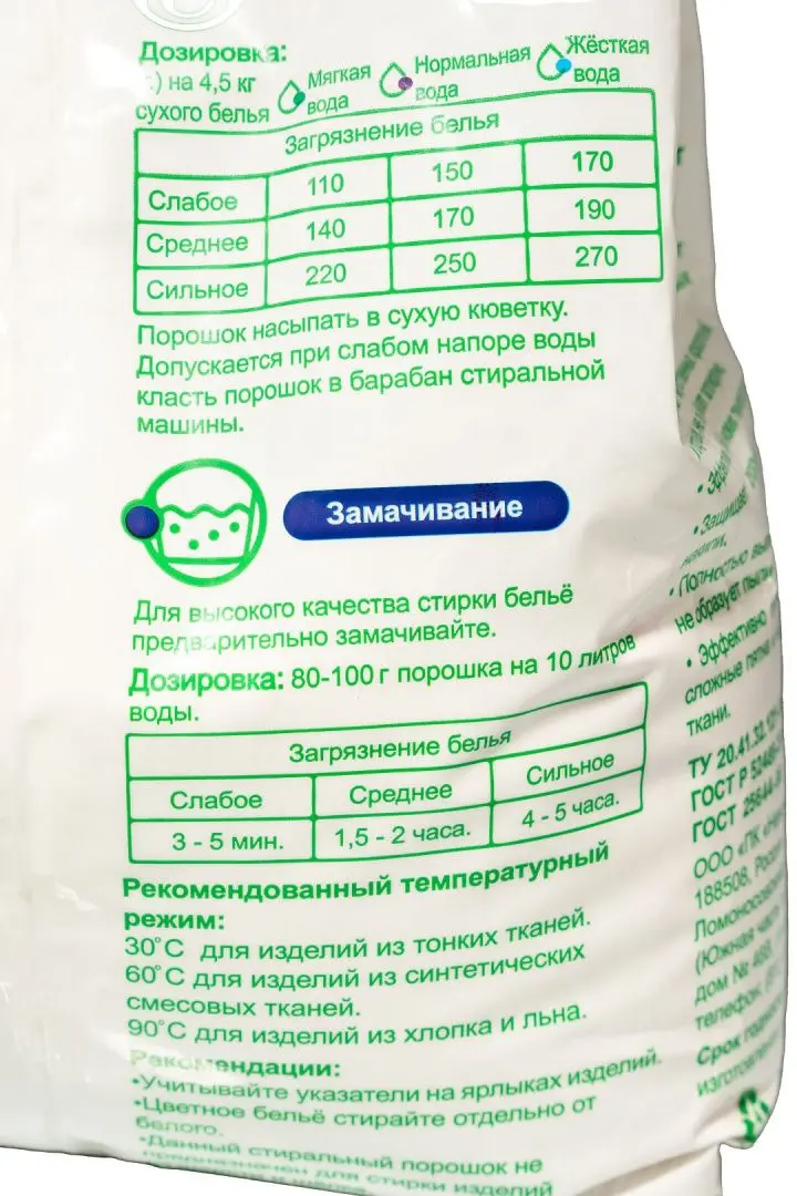 /шт.Стиральный порошок предназначен для стирки цветных и белых изделий из хлопчатобумажных, льняных, синтетических тканей, а также тканей из смешанных волокон. Не подходит для стирки изделий из шерсти и шелка.