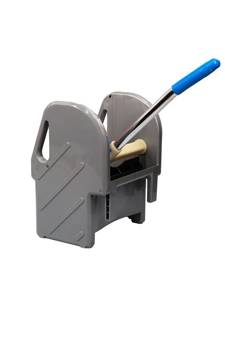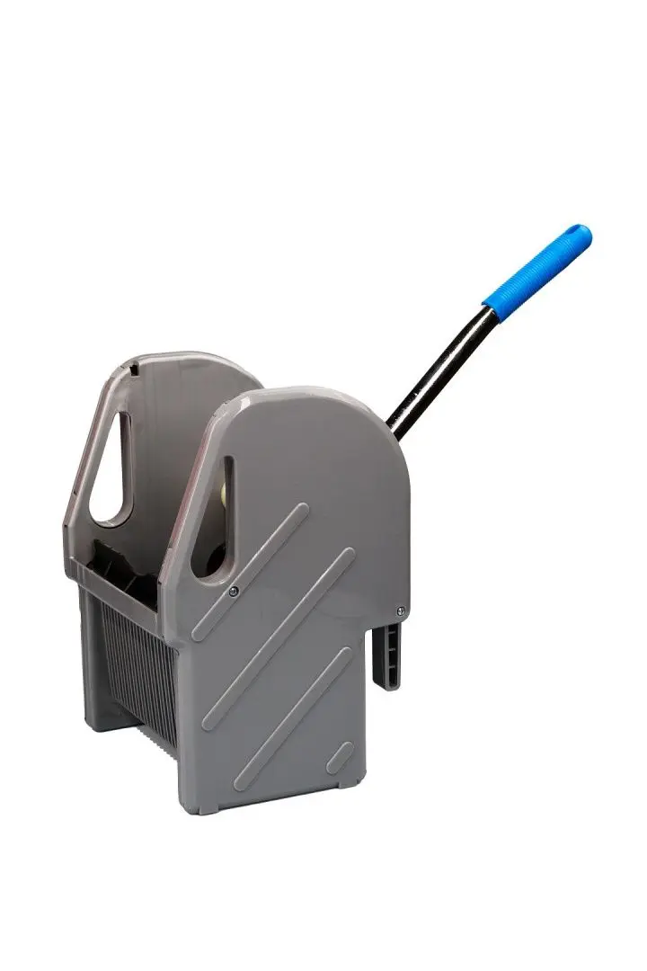 Отжим расположен на тележке и позволяет быстро и эффективно отжимать мопы, не пачкая рук.
