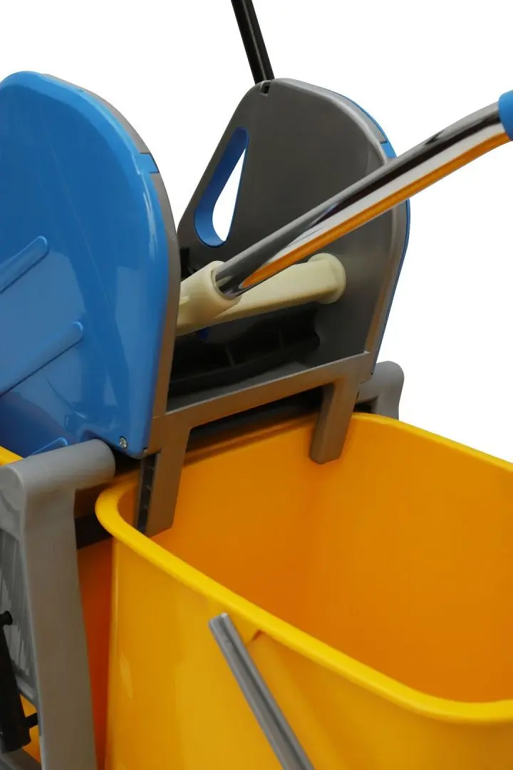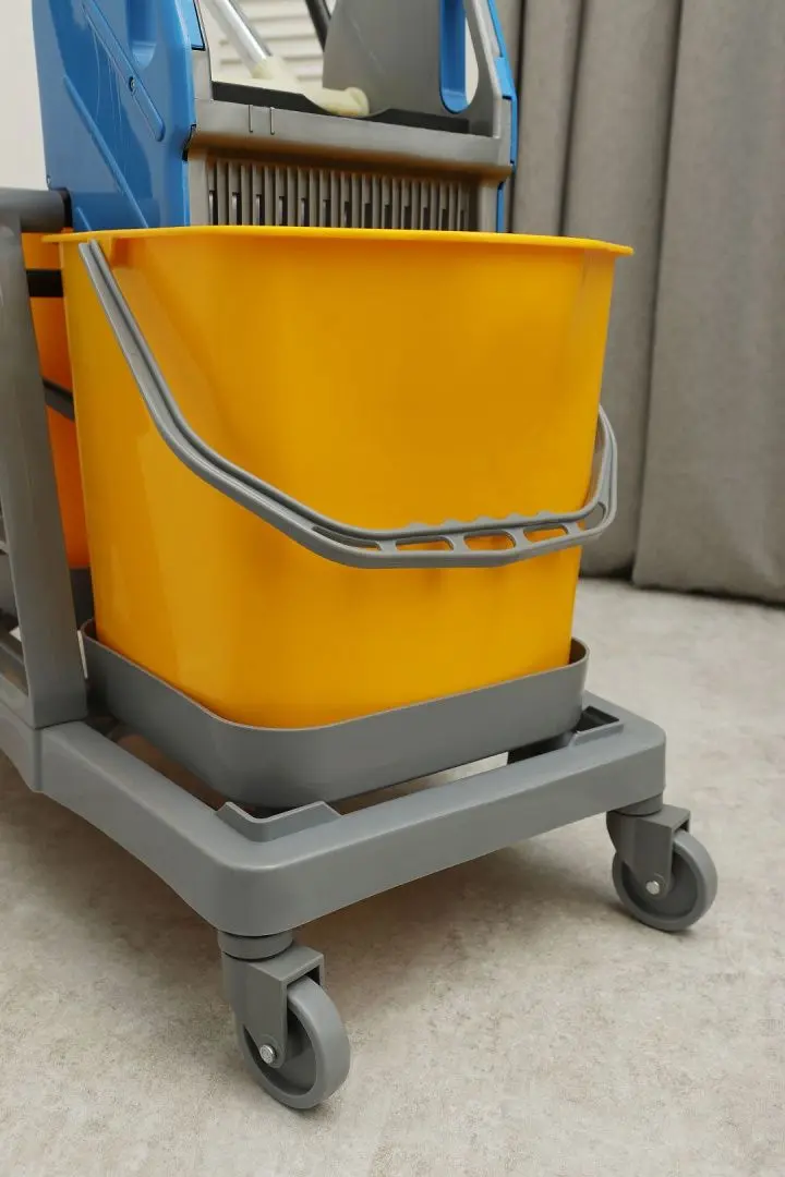 Благодаря своей конструкции тележка обеспечивает удобство и эффективность уборки, что делает её незаменимым инструментом для клининговых компаний и профессиональных уборщиков.